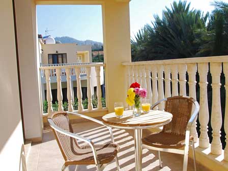 Side balcony has lovely views towards orchard next door and hills behind. Front balcony overlooks pool and garden, and there is a sea view too.